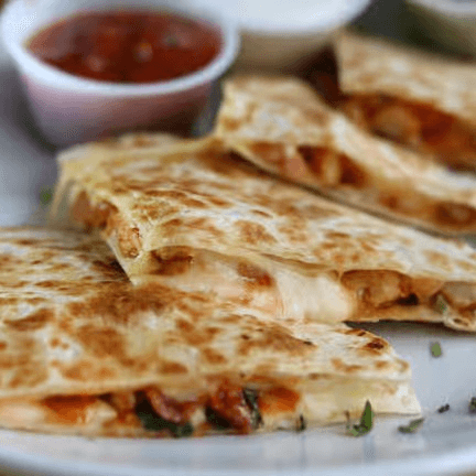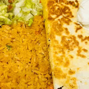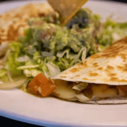 Strips of beef or chicken, grilled onions, bell peppers and tomatoes. Flour tortilla filled with cheese and steak or chicken. Served with guacamole salad and choice of rice or beans