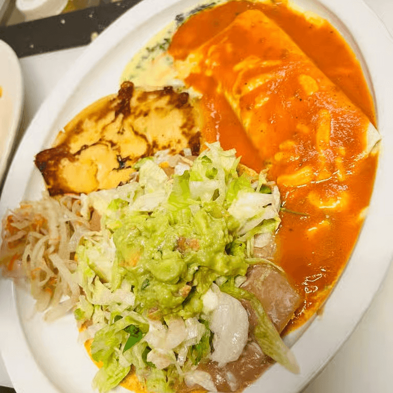 Flour tortilla filled with cheese and beef or chicken. Served with guacamole salad and choice of rice or beans