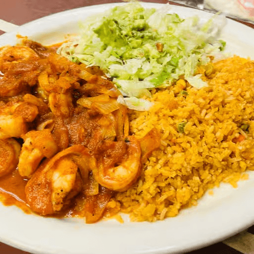 Grilled shrimp with onions and red sauce. Served with rice and guacamole salad
