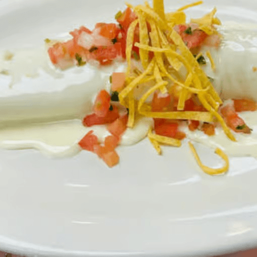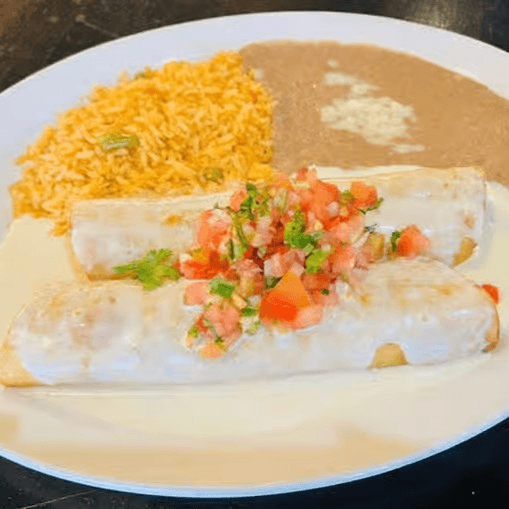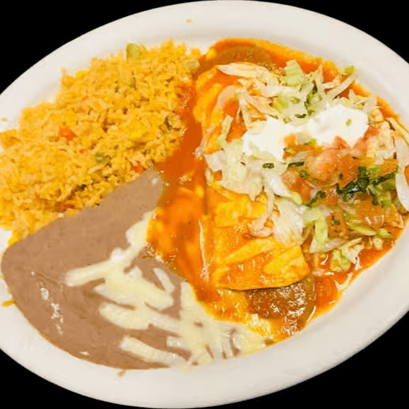 Three corn tortillas rolled and baked with, chicken, beef or cheese. Topped with special green sauce, sour cream and salad. Served with rice and beans.