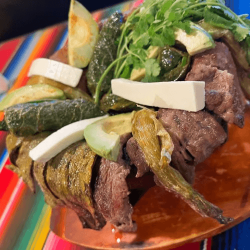 Grilled steak with lettuce, tomatoes and onions, jalapenos and avocado. Served with rice, refried beans and tortillas