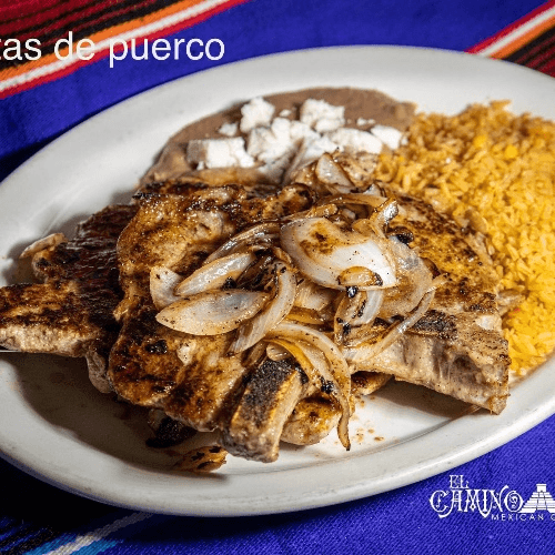 Grilled pork chop topped with grilled onions, served with rice beans and tortillas.