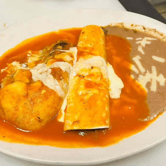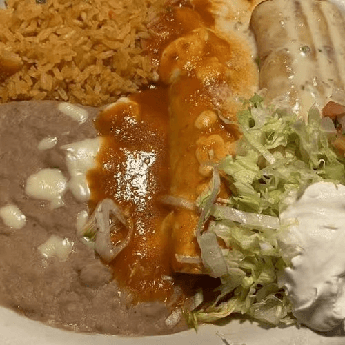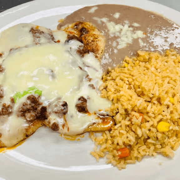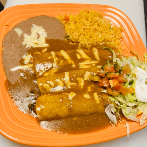 Three corn tortillas rolled and baked with chicken, beef or cheese. Topped with mole sauce, lettuce, tomatoes, and cotija cheese. Served with rice and beans.