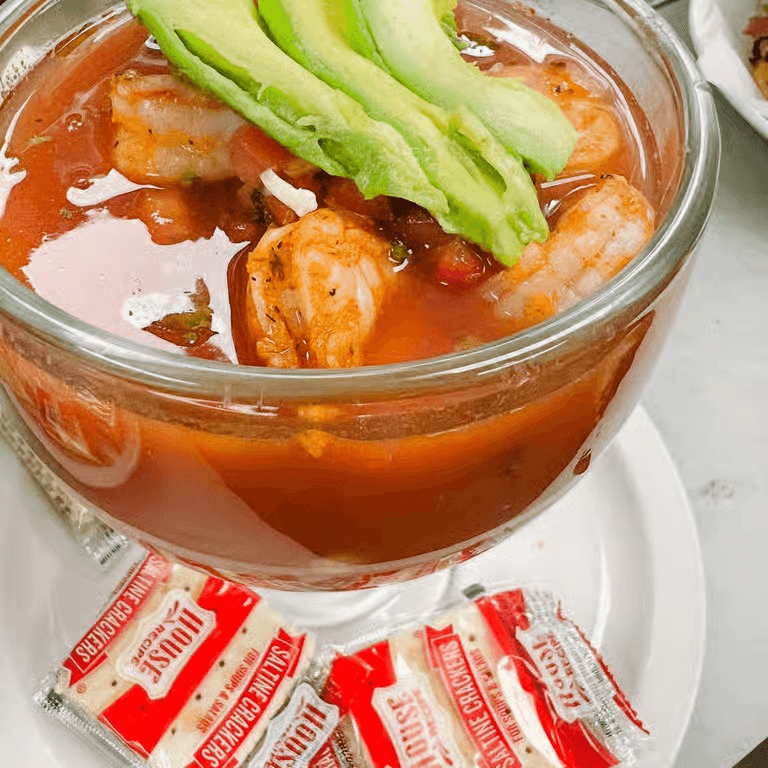 Shrimp cocktail soup with chopped tomatoes, onions, cilantro and avocado