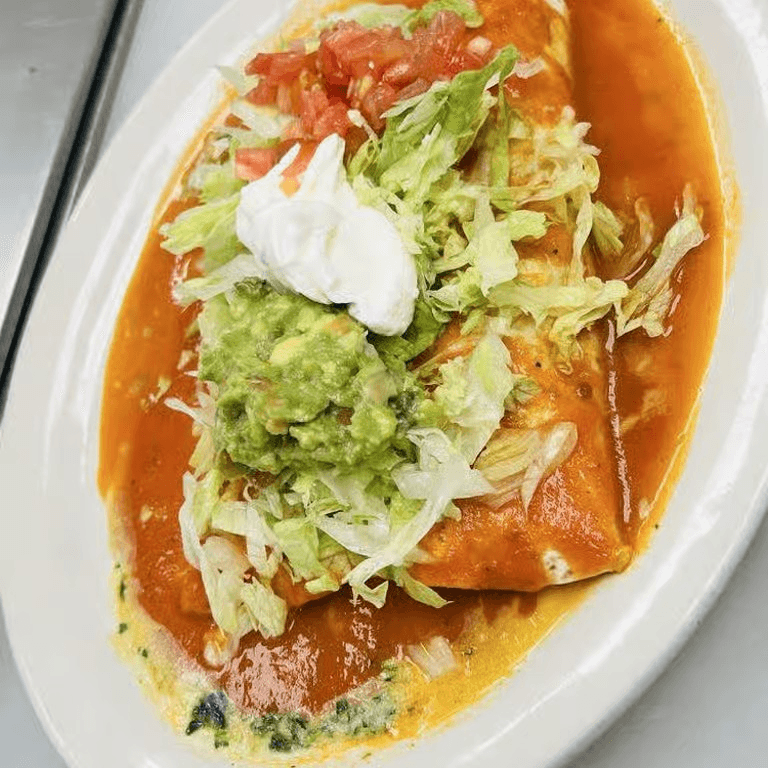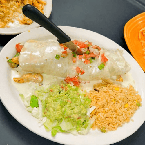 Jumbo burrito stuffed with steak, chicken, and shrimp fajita. Topped with cheese sauce. Served with rice and guacamole salad.