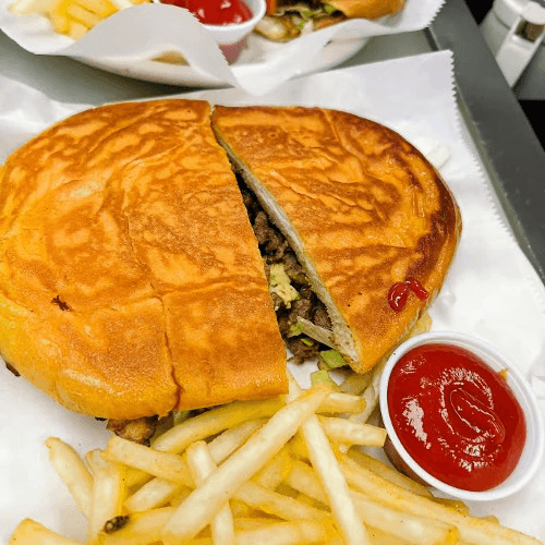 Steak or chicken grilled with bell peppers, onions, tomato and cheese