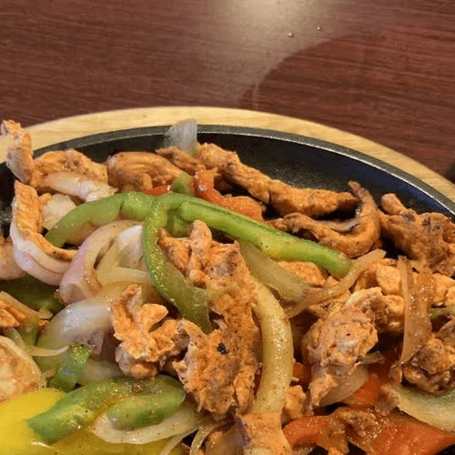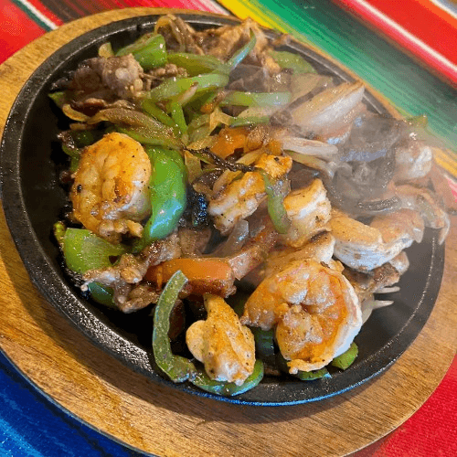 Steak, chicken and shrimp. Comes with onions, green peppers and tomatoes. Served with rice, beans, guacamole, sour cream and tortillas