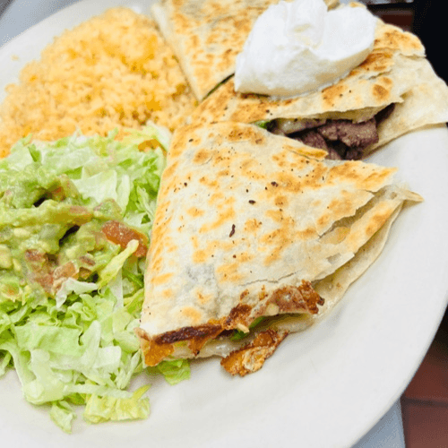 Flour tortilla filled with cheese and steak or chicken. Served with guacamole salad and choice of rice or beans
