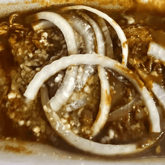 Four cheese enchiladas over rice, covered with special bean sauce, chorizo, queso fresco, cotija cheese, and onions.