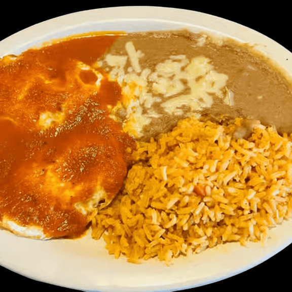 Two over easy eggs topped with red sauce. Served with Spanish rice and refried beans with tortillas