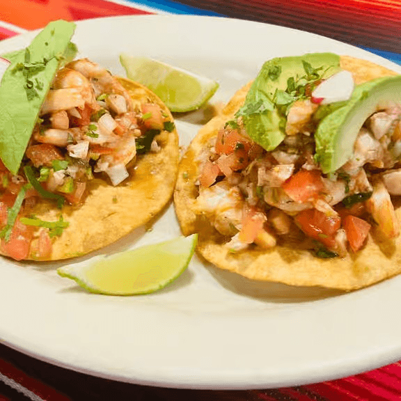 2 pieces. Tomatoes, onions cilantro, lime juice, slice of aguacate, on top de fried corn tortilla