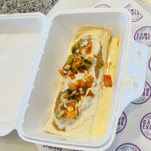 One burrito with chicken and chipotle sauce, covered with beans, cheese, pico de gallo and tortilla strips