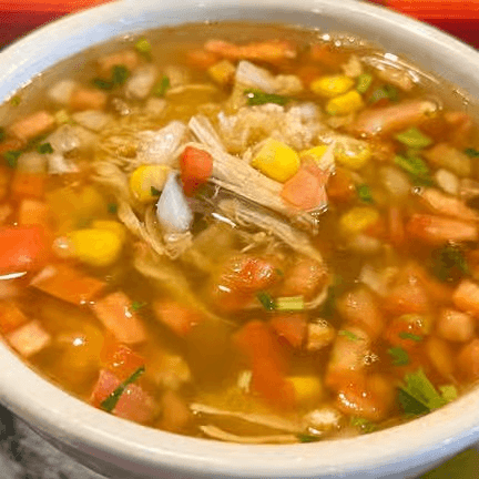 Chicken and rice soup with tomatoes, cilantro, onions and lime juice.