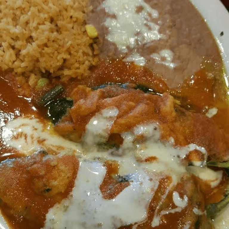 Two poblano peppers stuffed with cheese, fried in egg batter, covered in special sauce. Served with rice and beans.