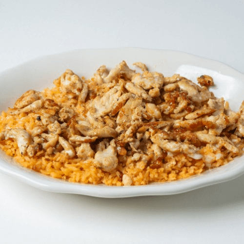 This is our most popular dish. A delicious and classic comfort food. Your choice of meat on a bed of cheesy rice. If you want to add vegetables go to our peluza dish.
