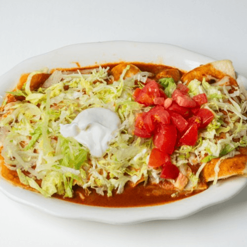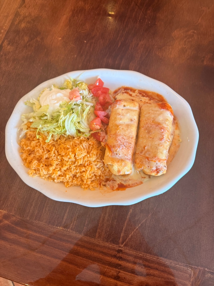 Two chimichangas filled with shredded chicken* or shredded beef. Topped with cheese dip and burrito sauce. May also request no burrito salsa and just cheese dip to make it "Pollo Fundido". Served with rice, lettuce, sour cream, and diced tomatoes.
