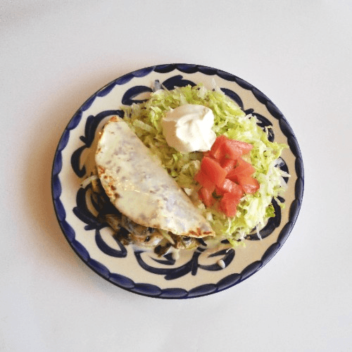 A quesadila filled with your choice of grilled chicken or steak and fajita vegetables (bell peppers, onions, and tomatoes). Served with rice, refried beans, lettuce, sour cream, and diced tomatoes.