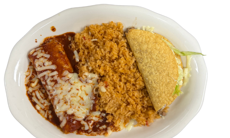 One crunchy taco, one enchilada, Served with rice and refried beans. May also substitute crunchy taco with a soft taco or the enchilada for a burrito for an up-charge.