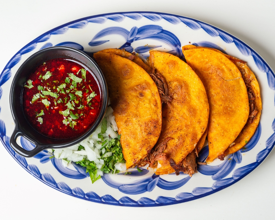 A cross between a taco and a quesadilla, our delicious birria, a Mexican stewed shredded beef, is folded into (3) cheesy tortillas. Served with the same beef broth that gives them a red colors, and rice and refried beans.