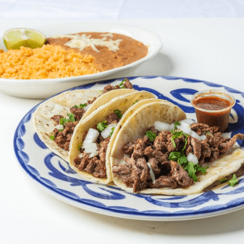 Your choice of meat over (3) corn tortillas. Cilantro, diced onions, and a lime wedge on the side. Served with rice and refried beans. Spicy homemade red salsa upon request. May also make tacos "a la diabla" to which adds grilled onions and chorizo for an extra $2.25