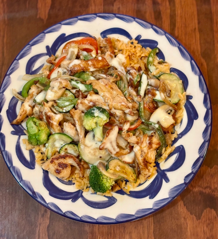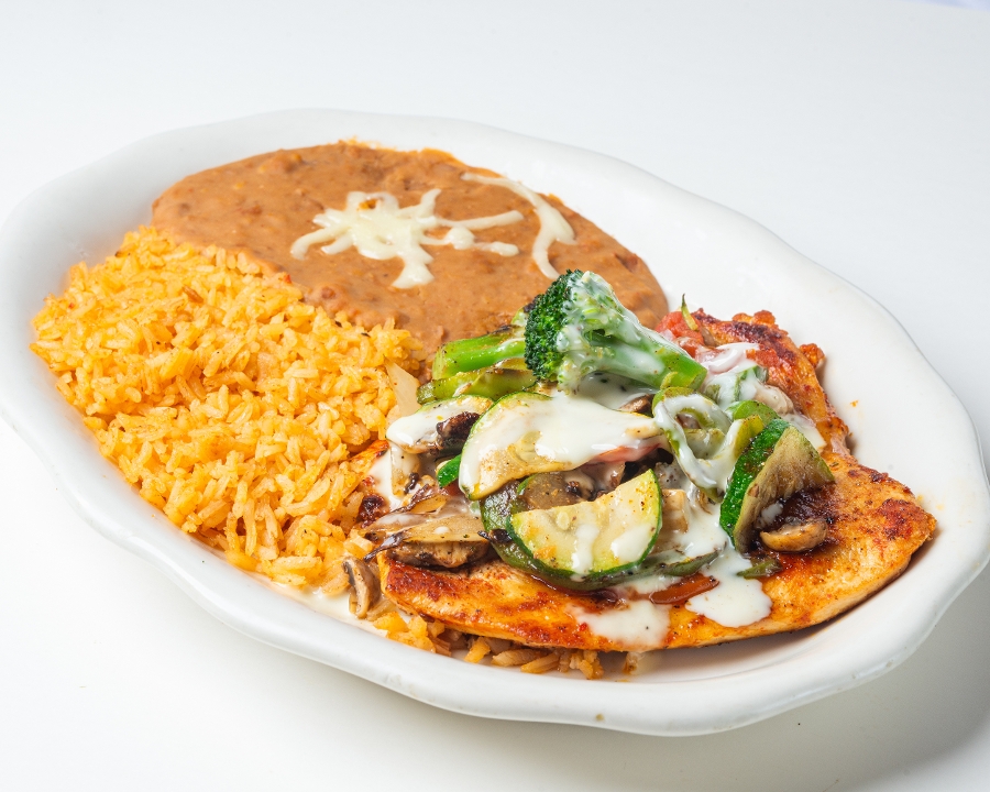 Grilled chicken breast topped with grilled bell peppers, onions, tomatoes, broccoli, zucchini, and mushrooms and cheese dip. Served with rice & refried beans.
