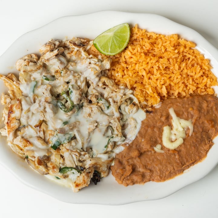 Grilled chicken strips, grilled onions and chile poblano slices mixed in a creamy sauce. Served with rice and refried beans. Tortillas can be requested.