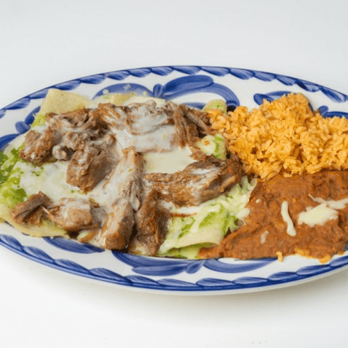 (3) Cheese Enchiladas topped with carnitas, cheese dip, and salsa verde. Served with rice & refried beans on the side.