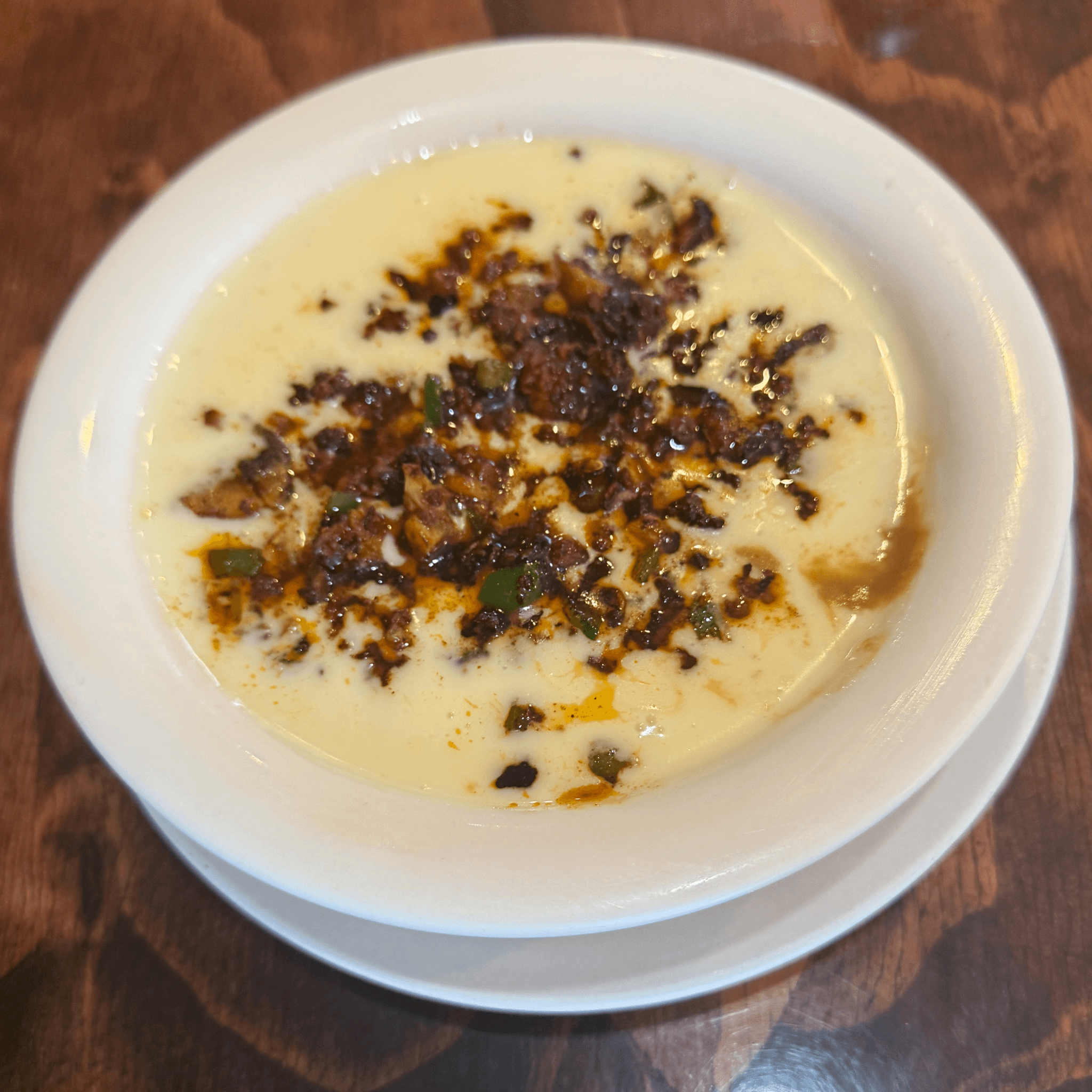 Large cheese dip with refried beans, grilled chorizo, grilled mushrooms and grilled pickled jalapeños.