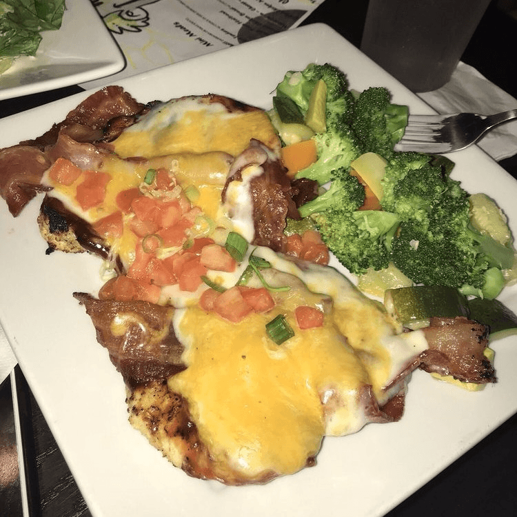 Grilled boneless chicken breast covered with 66 BBQ Sauce, jalapeno bacon, Monterey Jack and Cheddar cheeses topped with diced tomatoes and green onions. Served with mixed vegetables and garlic mashed potatoes