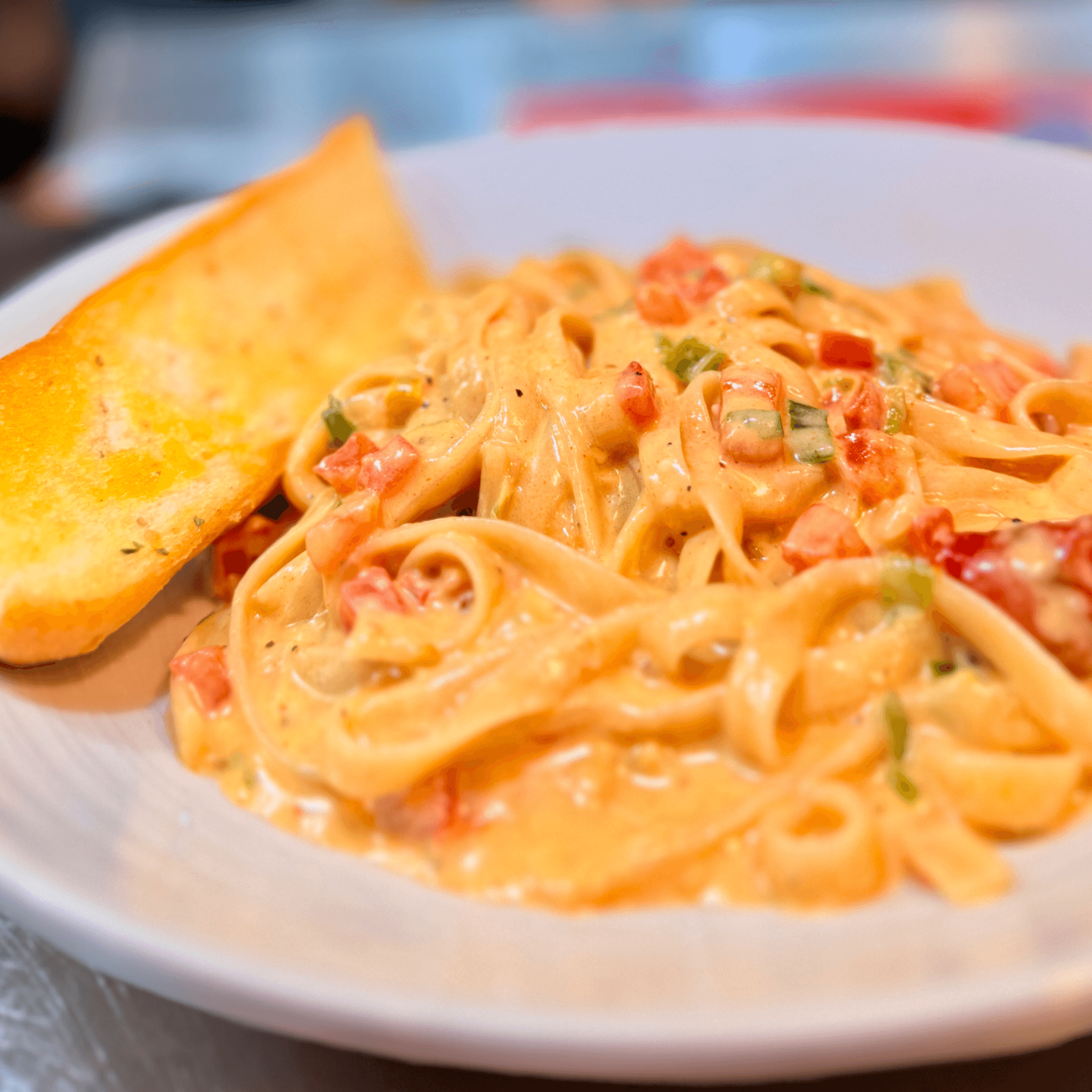 Cajun Alfredo sauce over fettuccine with roasted tomatoes and green onions. Served with toasted garlic bread