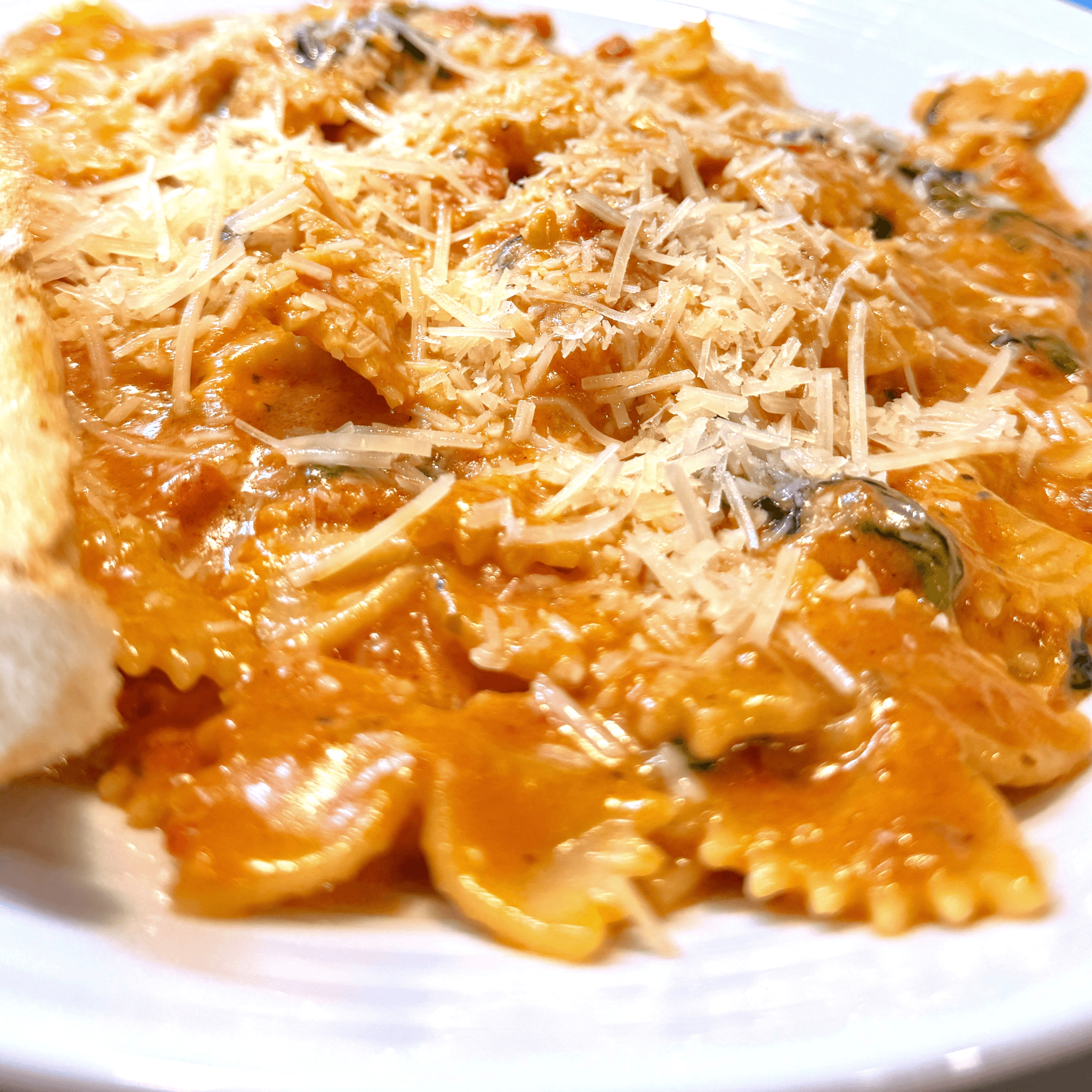 Bowtie pasta tossed with sauteed spinach in a roasted tomato basil cream sauce topped with shredded Parmesan. Served with toasted garlic bread
